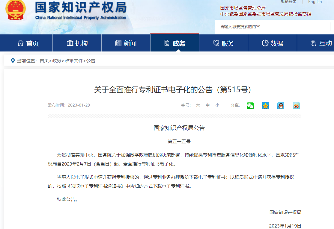 其中提到,為貫徹落實黨中央、國務(wù)院關(guān)于加強數(shù)字政府建設(shè)的決策部署,持續(xù)提高專利審查服務(wù)信息化和便利化水平,國家知識產(chǎn)權(quán)局自2023年2月7日(含當日)起,全面推行專利證書電子化。