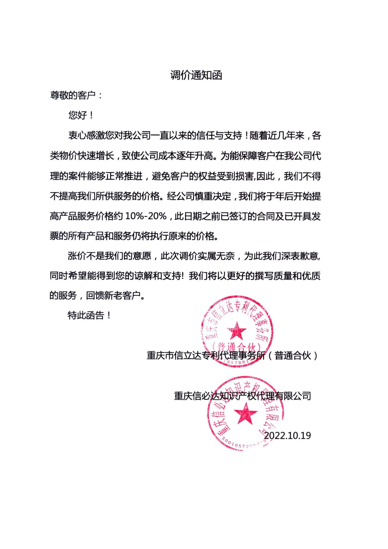 衷心感激您對我公司一直以來的信任與支持!隨著近幾年來,各類物價快速增長,致使公司成本逐年升高。為能保障客戶在我公司代理的案件能夠正常推進(jìn),避免客戶的權(quán)益受到損害,因此,我們不得不提高我們所供服務(wù)的價格。經(jīng)公司慎重決定,我們將于年后開始提高產(chǎn)品服務(wù)價格約10%-20%,此日期之前已簽訂的合同及已開具發(fā)票的所有產(chǎn)品和服務(wù)仍將執(zhí)行原來的價格。