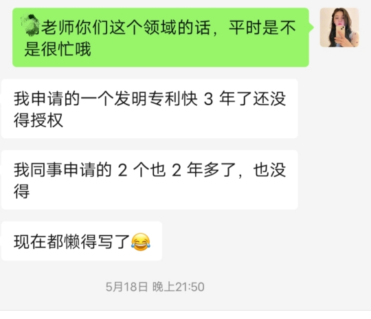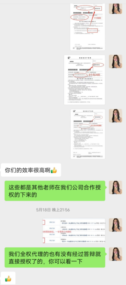 客戶是我在5.5號通過撥打電話,打出來的,最開始客戶說自己暫時不需要,后期可能需要,也愿意先加微信,加上之后就是簡單的互相問好,自我介紹,公司的介紹,然后就沒有其他的過多的交流了。中途也有給客戶發(fā)我們公司的授權證書,但是客戶從來都是只讀不回,直到5.18號晚上,給客戶發(fā)了發(fā)明專利預審6個月左右下發(fā)結果的相關信息。