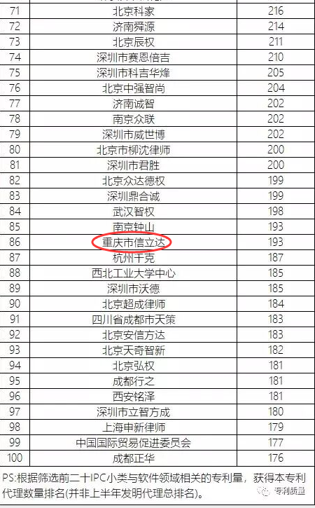 2019.10.12一條顯眼的新聞出現(xiàn)在立信達家人的眼前,那就是重慶立信達經(jīng)相關(guān)專業(yè)機構(gòu)統(tǒng)計成功進入全國前二十IPC小類與軟件領(lǐng)域相關(guān)的專利量前100(第86名),而且是全重慶唯一一家進入全國排名前100的,這充分證明了客戶對我們的認可以及我司的專業(yè)和實力。