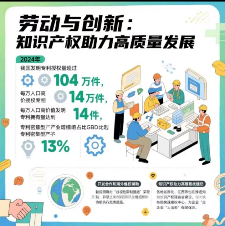 2024年的數(shù)據(jù)顯示,我國(guó)發(fā)明專利授權(quán)量超過(guò)104萬(wàn)件,每萬(wàn)人口高價(jià)值發(fā)明專利擁有量達(dá)到14件,專利密集型產(chǎn)業(yè)增加值占GDP比重超過(guò)13%。這些數(shù)字背后,是無(wú)數(shù)勞動(dòng)者的智慧成果。我國(guó)正加速建設(shè)知識(shí)產(chǎn)權(quán)強(qiáng)國(guó),深化國(guó)際合作與海外維權(quán)援助。例如,新規(guī)明確對(duì)“歧視性限制措施”采取反制,并禁止境內(nèi)組織協(xié)助執(zhí)行此類措施。各地如湖北、江西等也在推進(jìn)知識(shí)產(chǎn)權(quán)強(qiáng)省建設(shè),布局快速維權(quán)中心,為企業(yè)“走出去”保駕護(hù)航。這些舉措不僅提升了我國(guó)在全球知識(shí)產(chǎn)權(quán)領(lǐng)域的地位,也為創(chuàng)新者提供了更加有力的法律支持。