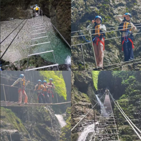 驚險接踵而來,經歷過深潭跳水,瀑布溪降,就是更加刺激的飛拉達,教練挨個檢查裝備,我們要翻越幾十米的懸崖,走過鋼繩橋,去往更接近終點的溯溪地點。最難的是那段懸空的鋼繩橋,兩根平行的鋼索在風里搖晃,腳下的鋼板間隔著三十公分寬的空隙,能看見底下圓滑鵝卵石鋪成的小溪。邁出第一步時,整個人像鐘擺似的晃起來,喉嚨發緊似乎只有吶喊才能給自己勇氣行走。每段路途都是刷新我們的人生經歷,雖然因為害怕高空以及濕滑的石壁而顫抖、尖叫、吶喊,但是當同事的手機舉起來時,依舊會把自己最好的狀態面對鏡頭,一生愛出片的中國人.